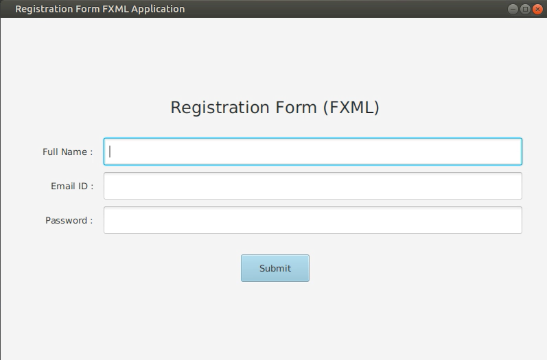 La méthode handleSubmitButtonAction() contient le code pour gérer la soumission du formulaire. Elle est annotée avec @FXML afin qu’elle puisse être utilisée dans le document FXML. Toutefois, en l’état, le code FXML n’est pas encore relié à cette méthode. Nous allons changer cela en intégrant la proprité onAction="#handleSubmitButtonAction" dans la balise Button du fichier FXML.